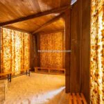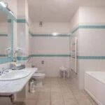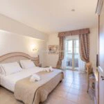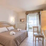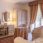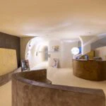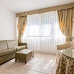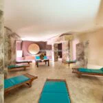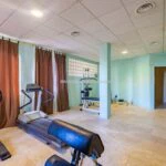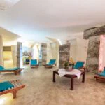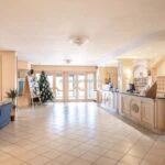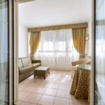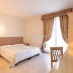 The main resort building has a surface area of 4,200 sqm – 45,192 sqft over several floors that include the common areas, an underground parking lot with twenty parking spaces, the large restaurant and about 65 rooms, all with private bathrooms. A large wellness centre with a whirlpool, sauna, emotional shower and Turkish bath has been built in the basement. An above-ground 12 × 6 m swimming pool with an artificial grass sunbathing area was built at the rear of the building.