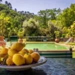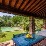 The villa is surrounded by 4.0 hectares (9.9 acres) of land that include a beautiful garden all around the villa, decorated with colourful flowers, olive trees and lemon trees. The remaining area (approximately 3.0 hectares) is covered in woodland. To the side of the main house, beyond the renovated barn, is the 12 × 6 m swimming pool with a terracotta and grass solarium. A natural spring within the property is used for garden irrigation.