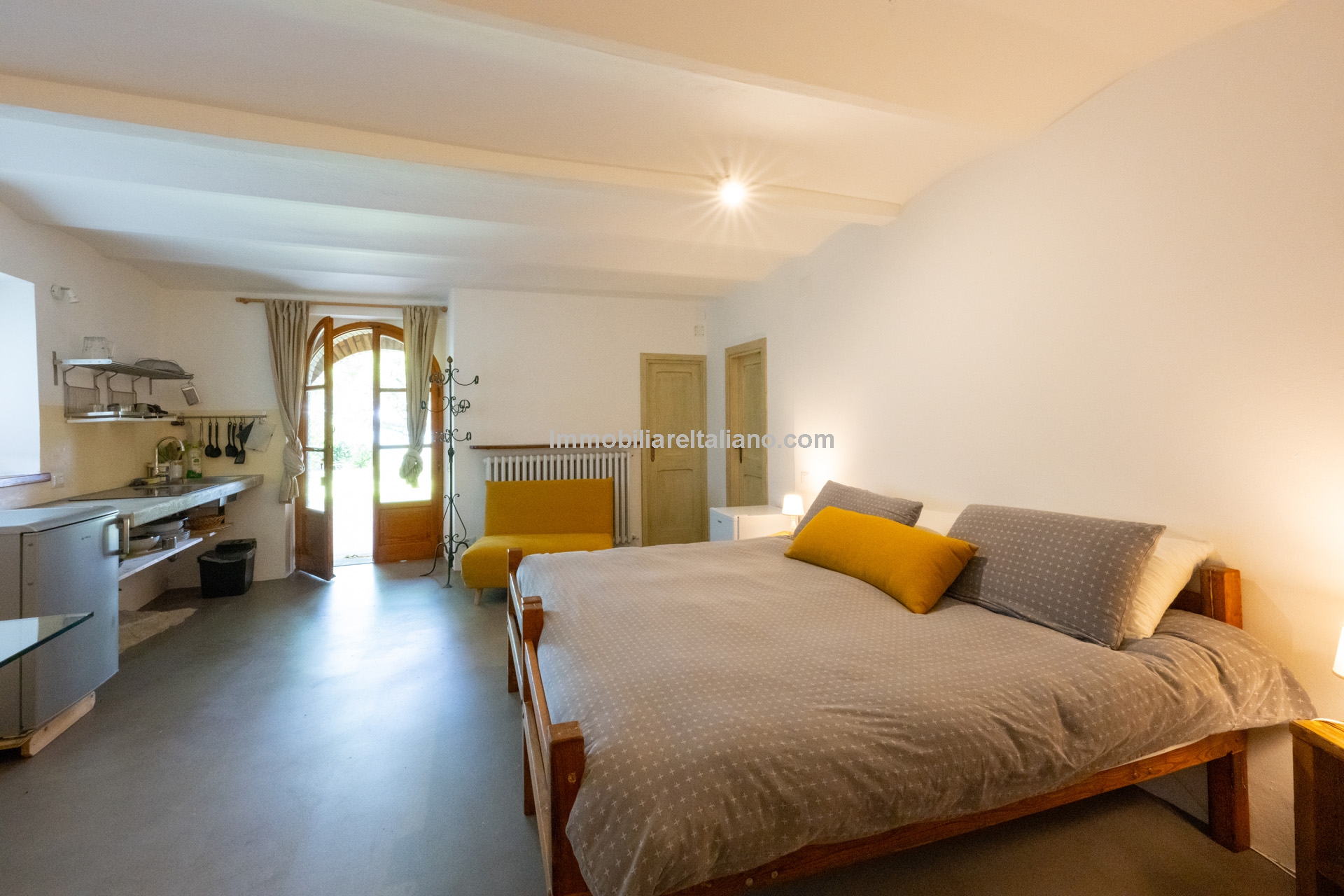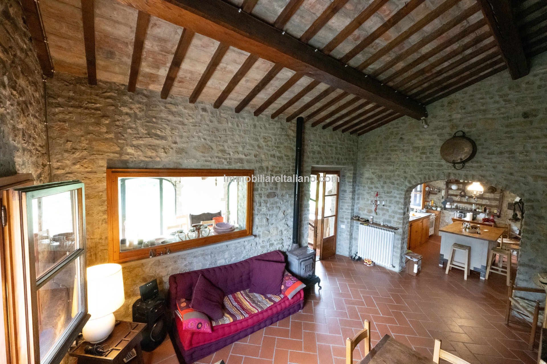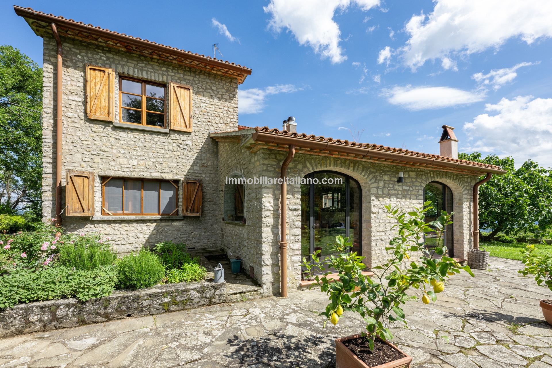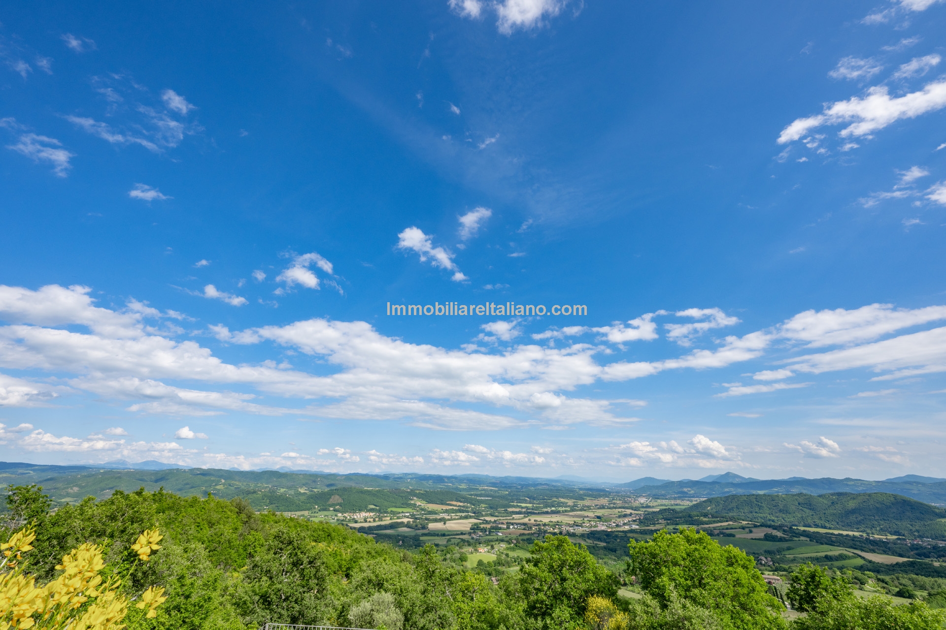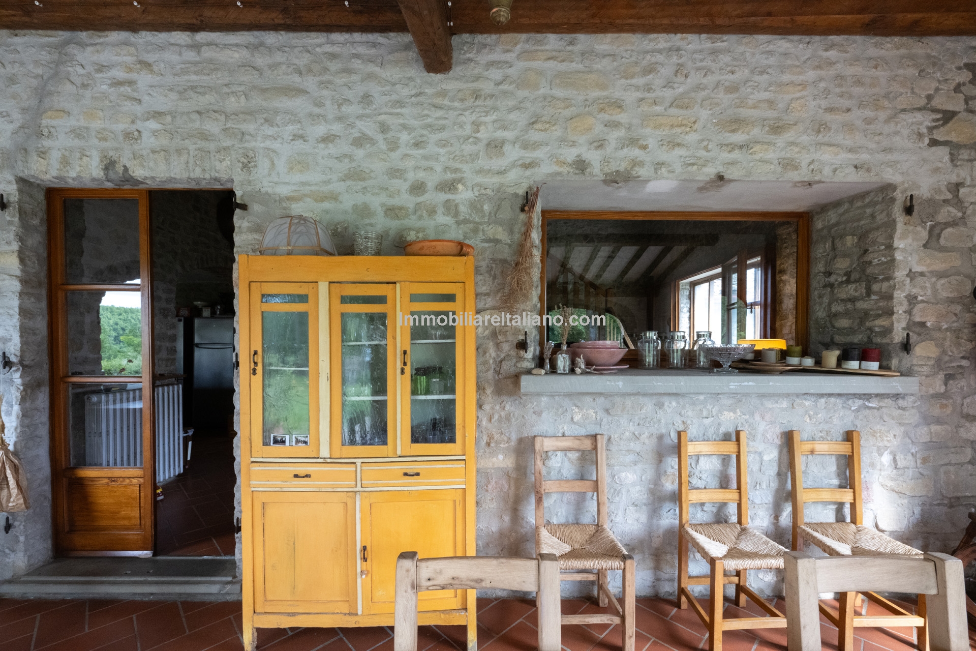 This restored farmhouse home with pool for sale is located in a hilly and panoramic position near Città di Castello, in the province of Perugia, Umbria. The property stands on a hilltop overlooking the Valtiberina valley and is accessed via a private, unpaved road of approximately 2 km that ends at the house, ensuring privacy and limited traffic. Basic services are available in San Secondo (4 km), while the historic centre of Città di Castello (8 km) provides full amenities, shops, restaurants and schools.