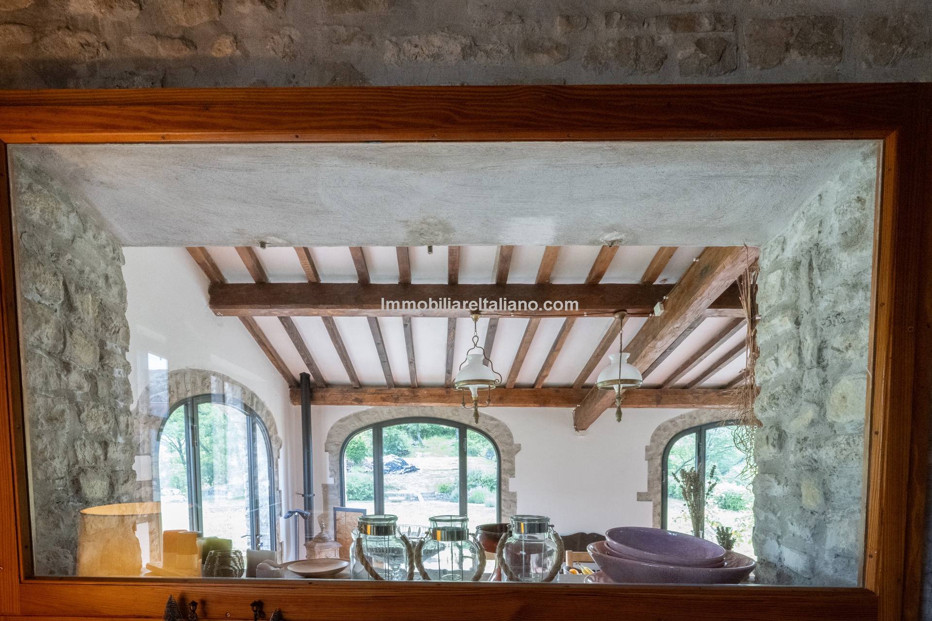 The building has been restored using traditional Umbrian materials, including exposed stone and brick walls, terracotta floors, wooden beams, vaulted ceilings and fireplaces. Large windows provide natural light and open views over the surrounding countryside. Utilities are fully connected, including mains water, electricity, natural gas heating with radiators, telephone and internet. The property holds an Energy Certificate rating of B.