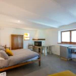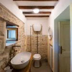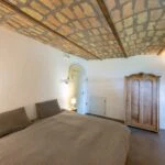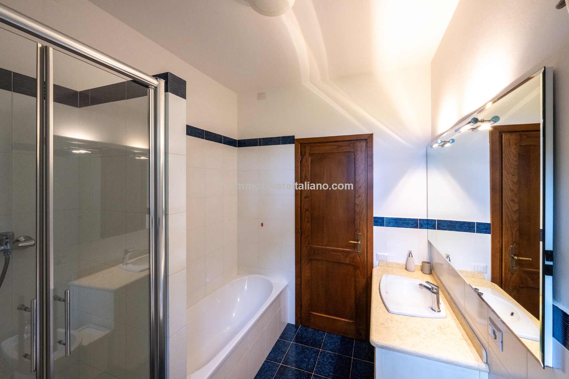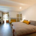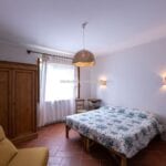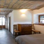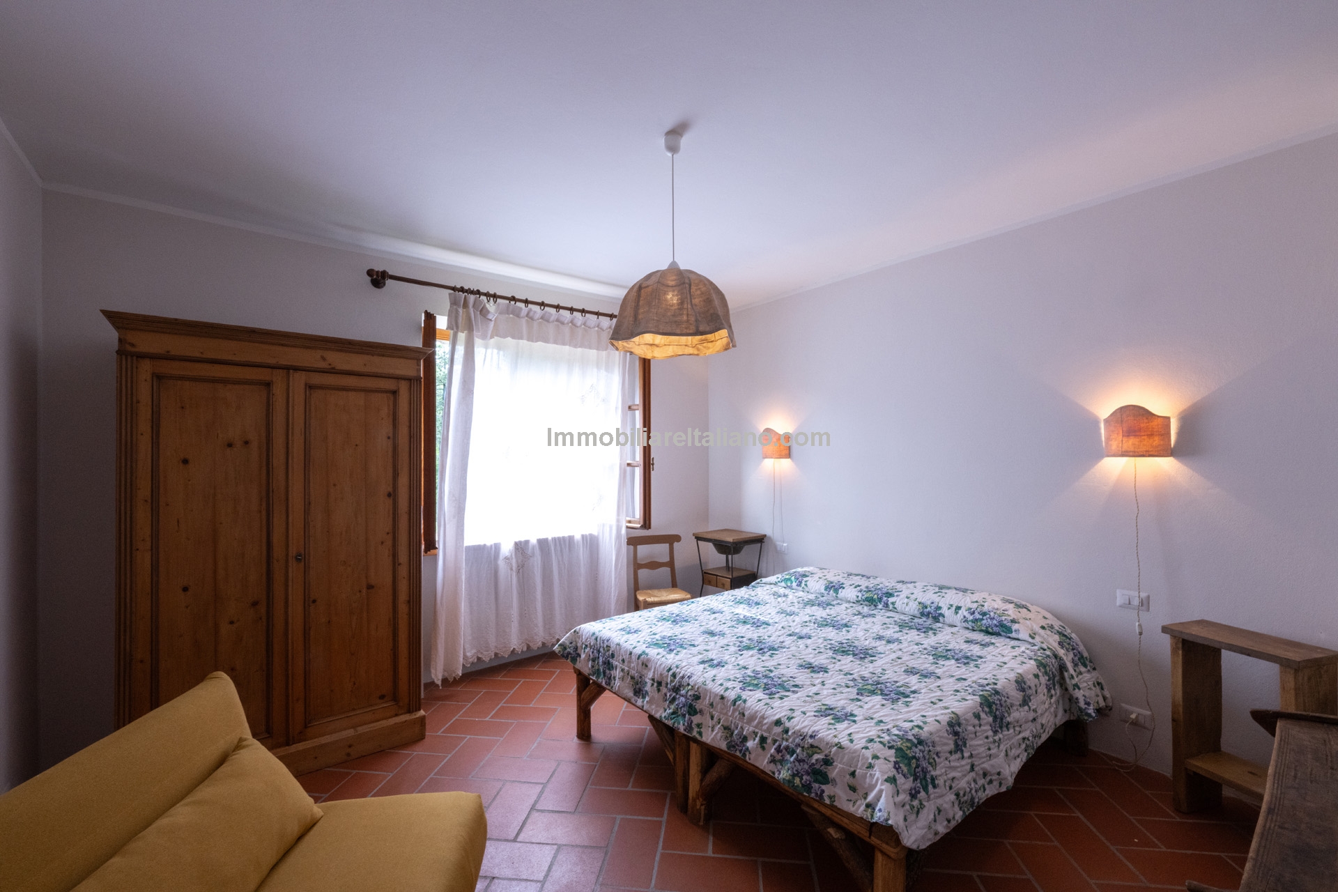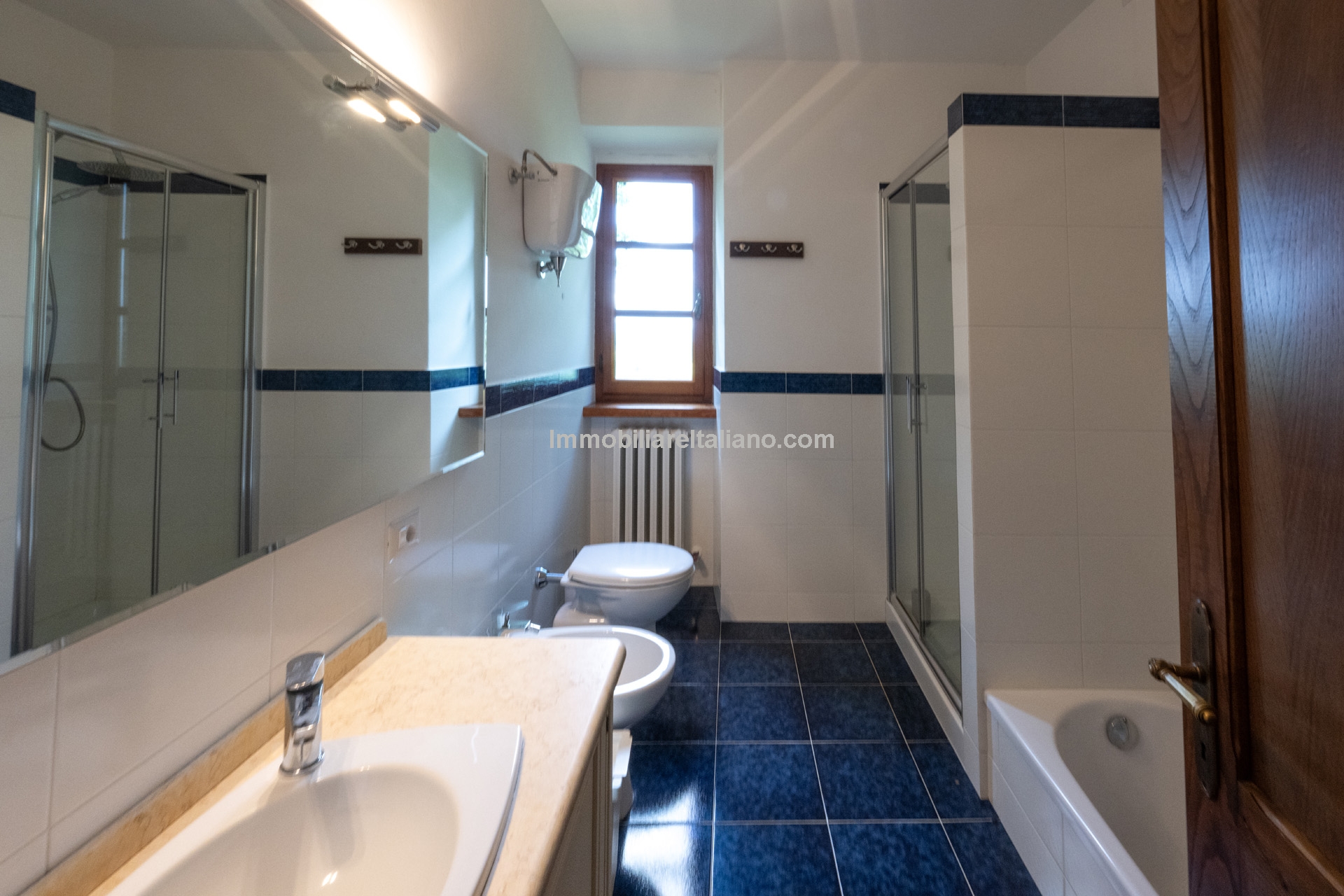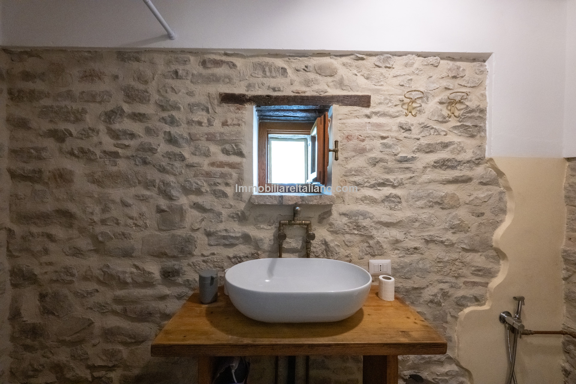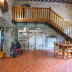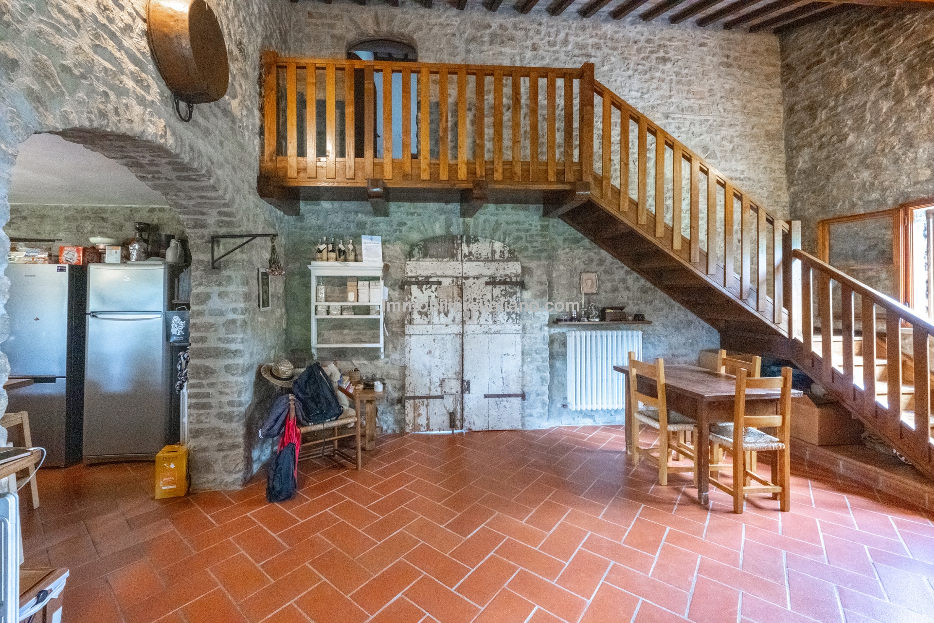 The first floor includes a second spacious living area, four bedrooms and three bathrooms. This level also has an independent external entrance via a traditional Umbrian stone staircase with a loggia, allowing the potential for a self-contained apartment or guest accommodation.