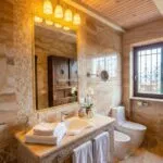 The main villa measures approximately 310 square metres and is positioned at the highest point of the estate. It has been fully restored using high-quality materials and modern building systems while retaining the proportions and structure of a traditional Tuscan farmhouse. Construction includes stone and brick walls, wooden floors, vaulted ceilings, and travertine detailing. The renovation incorporates sustainability measures such as cork and wool insulation, triple-glazed windows, underfloor heating and cooling powered by a heat-pump system, and a 15-kW photovoltaic installation.