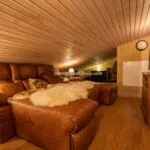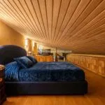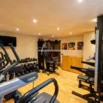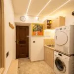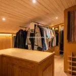 Internally, the villa is arranged over multiple levels. The ground floor opens into a bright living area with parquet flooring and direct access to a panoramic loggia enclosed with full-height glazing, allowing year-round use of the outdoor space. A fully equipped kitchen with direct garden access, a bedroom with a bathroom, a gym, and a laundry room complete this level. The upper floor contains two en-suite bedrooms, a study, and a dressing room. A finished attic provides additional flexible space suitable for storage, a relaxation area, or a hobby room.