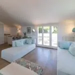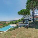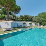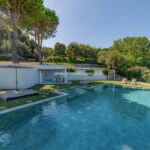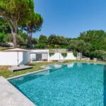 Outside, the 2,400 square metre garden includes lavender, jasmine, and Mediterranean plants. The 12 × 5.5 metre infinity pool sits on a southeast-facing terrace with sun loungers, umbrellas, and a covered area suitable for exercise or relaxing.