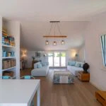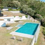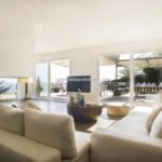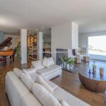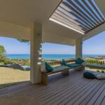 The villa covers 433 square metres and includes five bedrooms and four bathrooms. On the ground floor, there is an open-plan layout with a living room, dining area, and kitchen centred around a fireplace. Large windows allow natural light to fill the space and provide full sea views. The room opens onto a patio with a second fireplace and pergolas, offering additional outdoor living space for the warmer months.