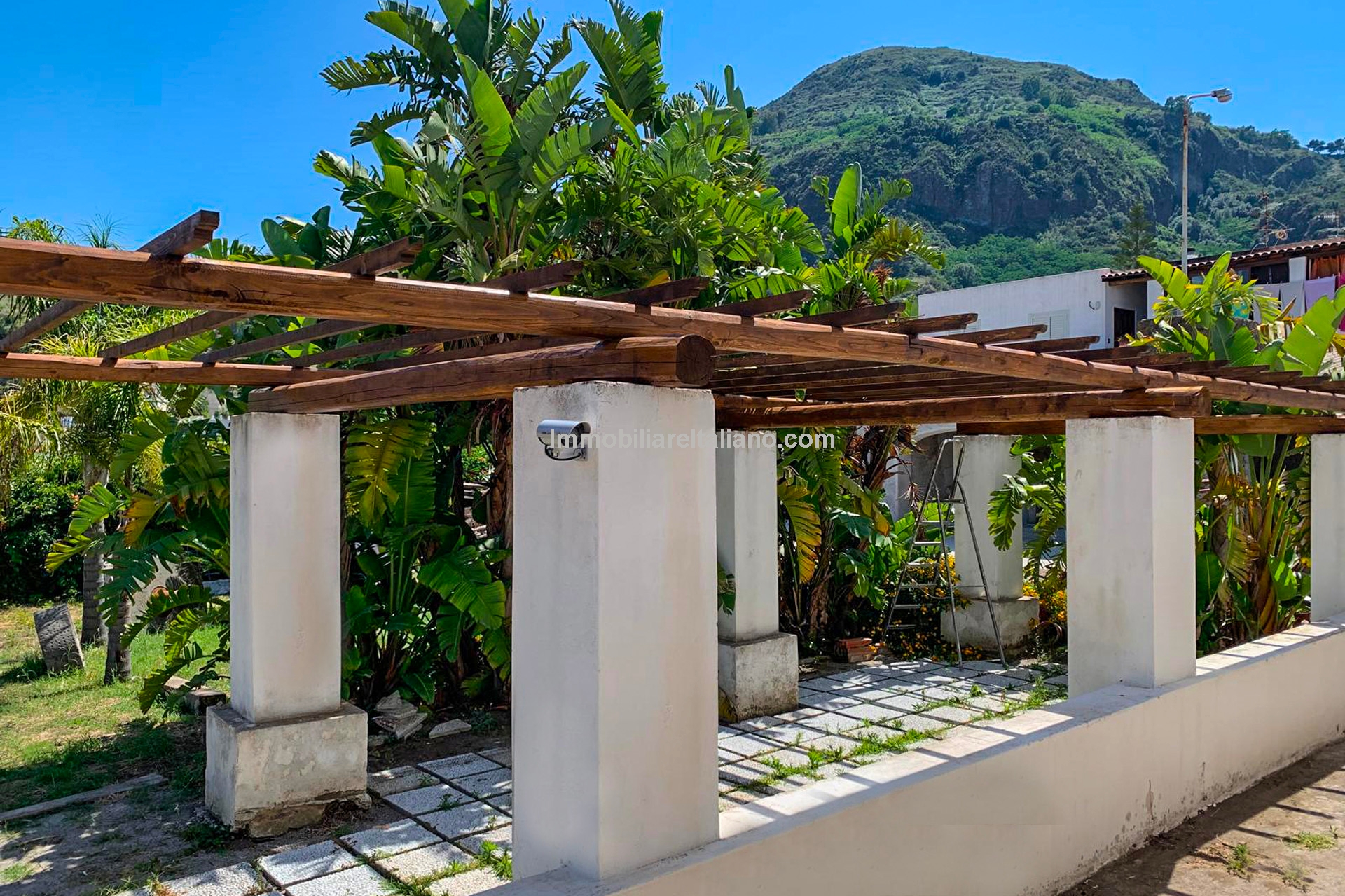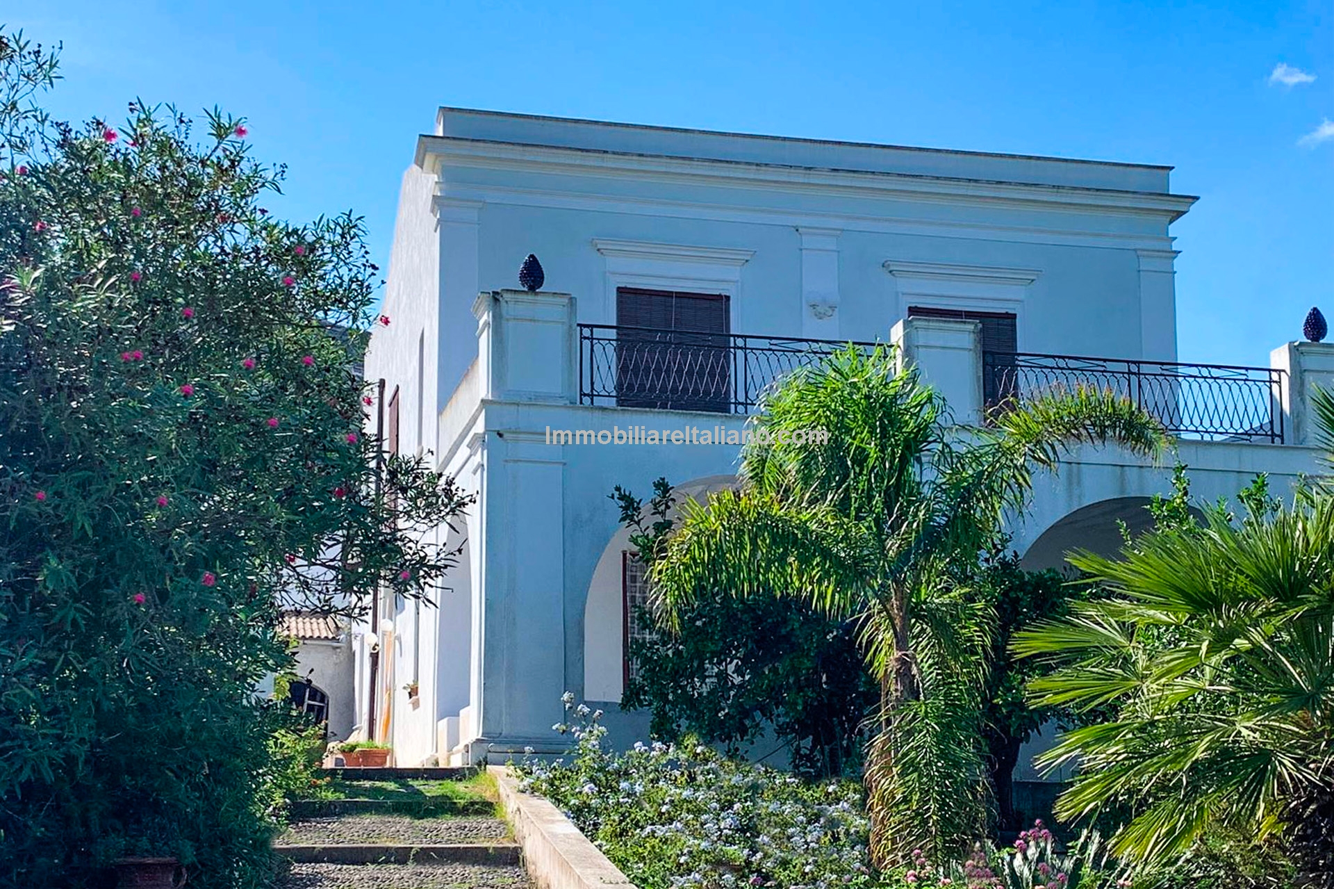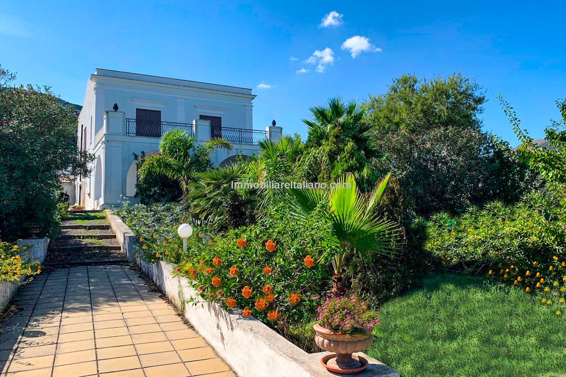 Historic seaside home for sale in Lipari, Italy. Late 18th-century villa with sea view, garden, pool, and orchard, just 100 m from the beach and near the port.