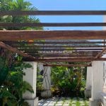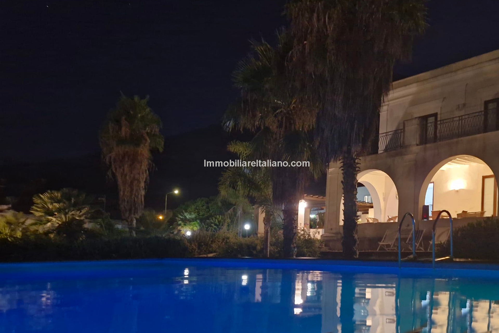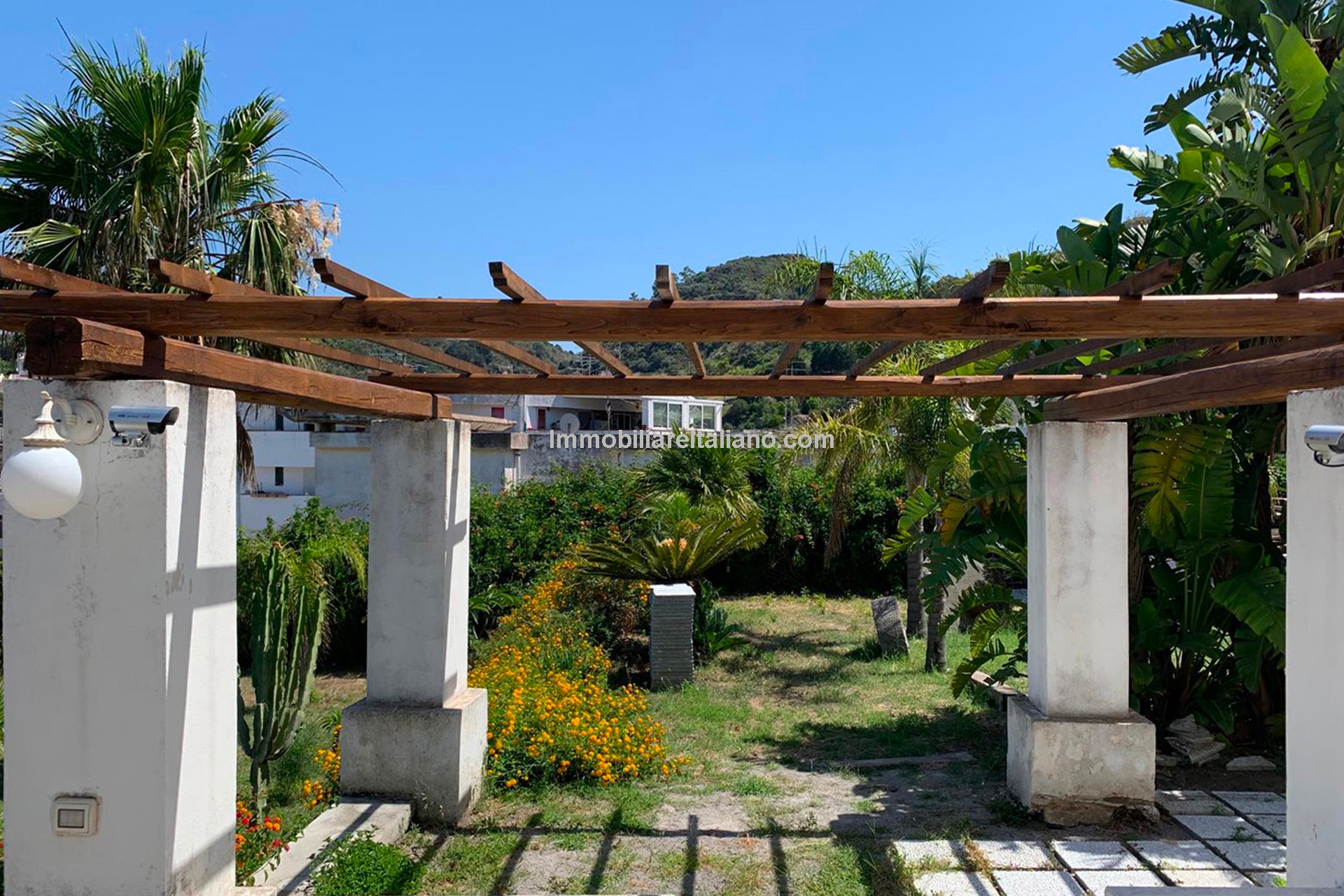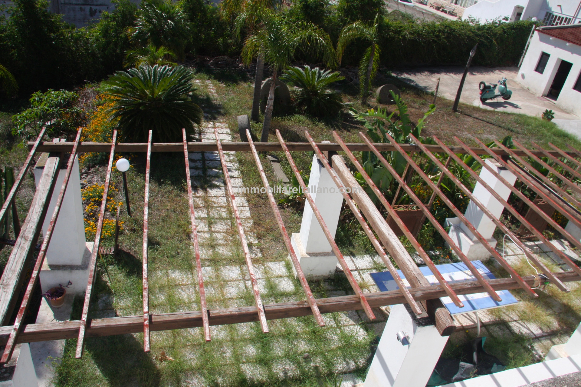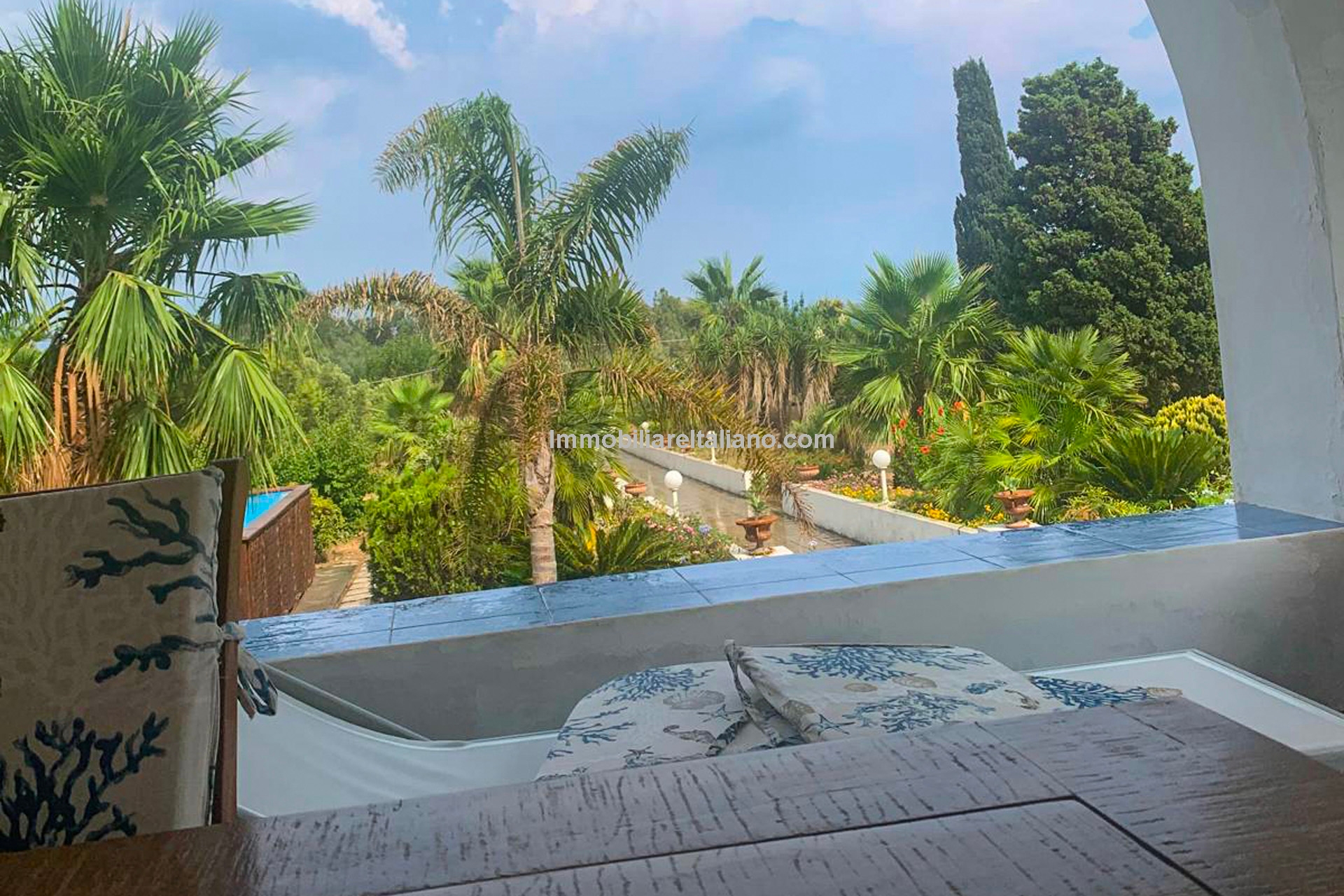 The 4,100 m² (1 acre) Mediterranean garden includes palms, olive and pine trees, along with a small citrus and fruit orchard producing oranges, lemons, almonds, walnuts, tangerines, and mulberries. In the centre of the garden sits a 10 × 5 m above-ground swimming pool. Water is supplied by two cisterns connected to the municipal aqueduct, one for domestic use and the other for irrigation.