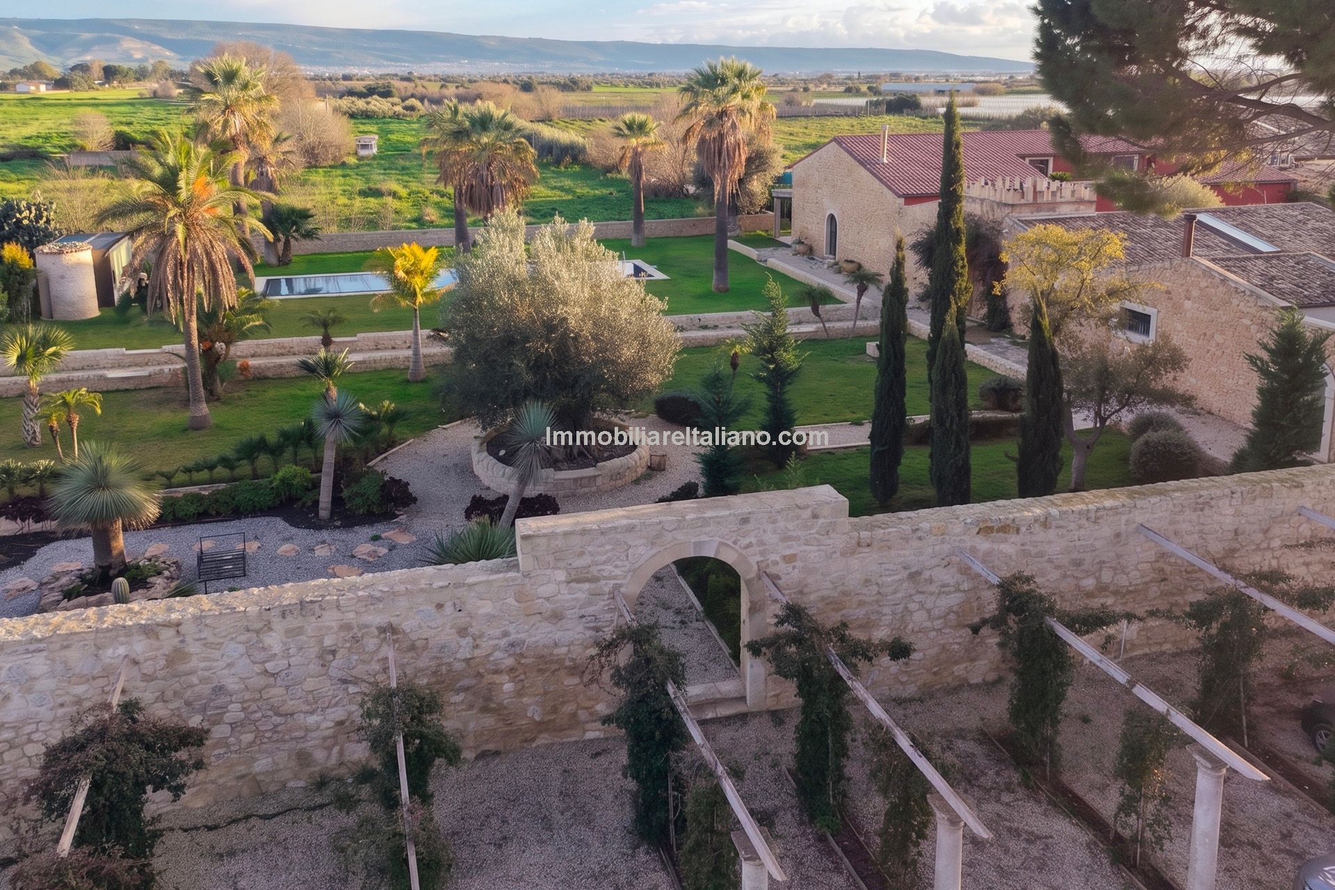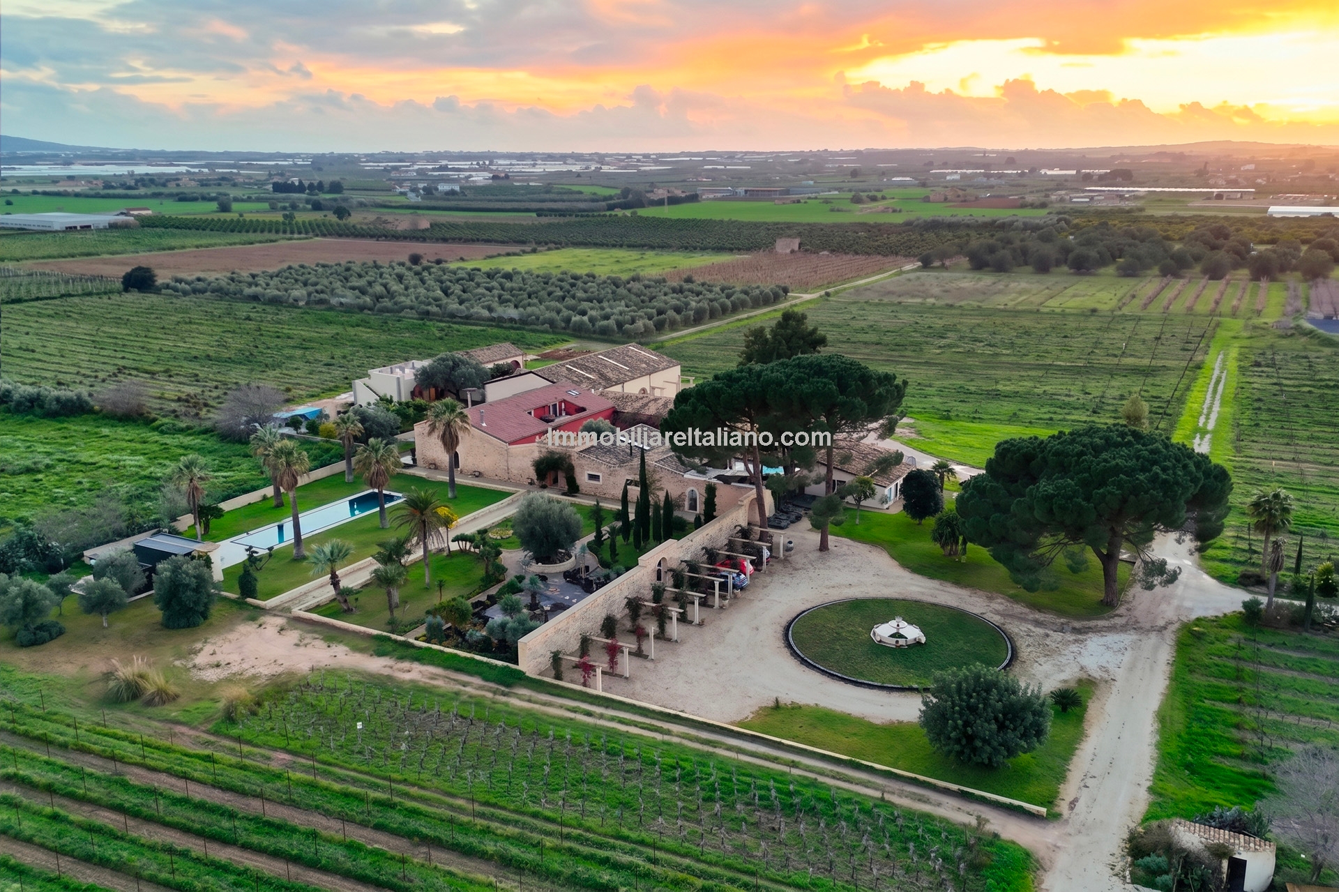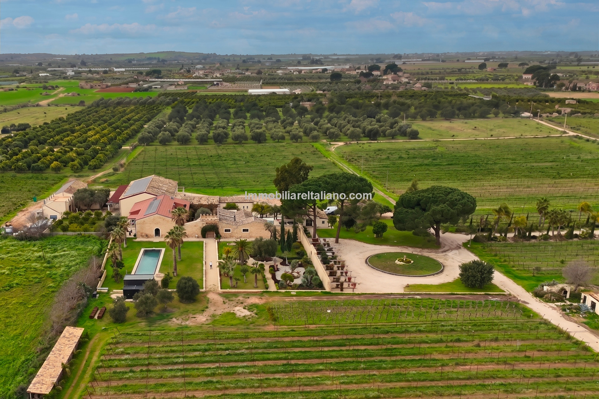 This Sicilian wine estate for sale is located in the municipality of Comiso, within the province of Ragusa, in southern Sicily. The property extends over approximately 10.5 hectares (25.9 acres), including 7.4 hectares of productive vineyards within the Vittoria DOCG area, known for quality Sicilian wine production. The estate combines a restored residential villa, guest accommodation, landscaped grounds, and a fully operational winery, producing up to 60,000 bottles per year. This positions the property as both a private residence and a working vineyard estate, suitable for buyers seeking an Italian wine business, vineyard investment, or lifestyle property in Sicily.