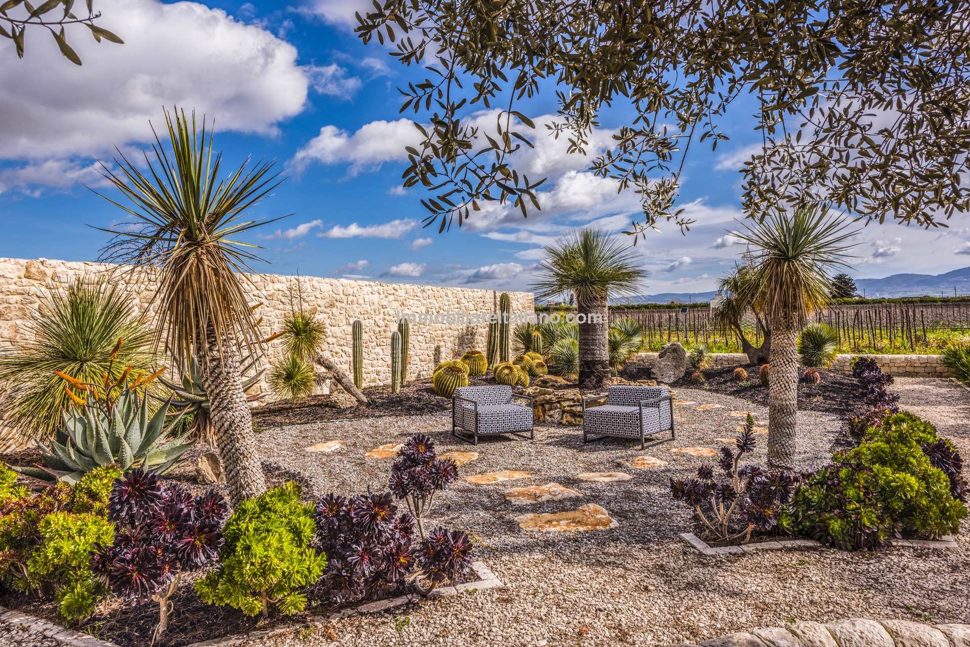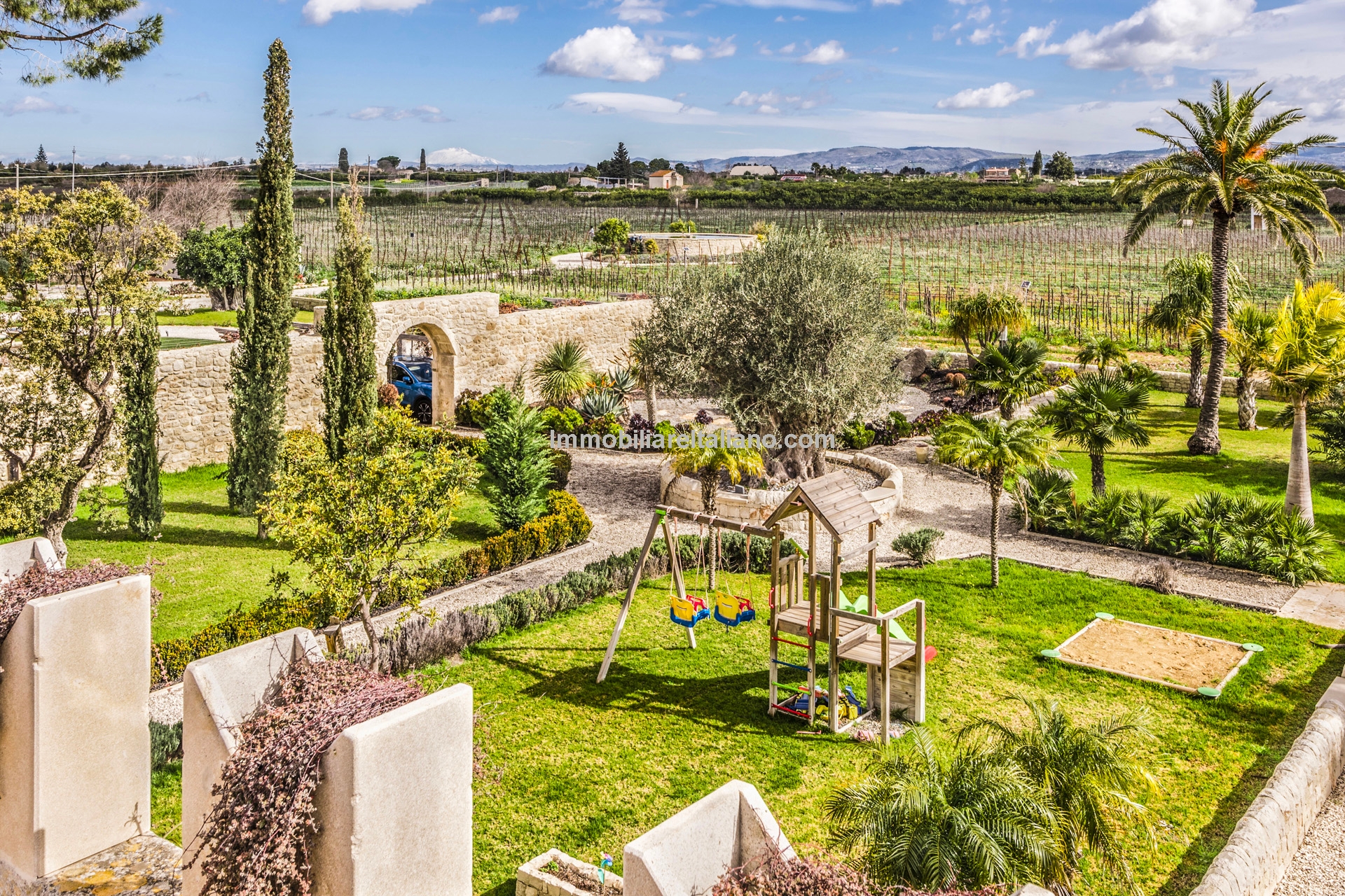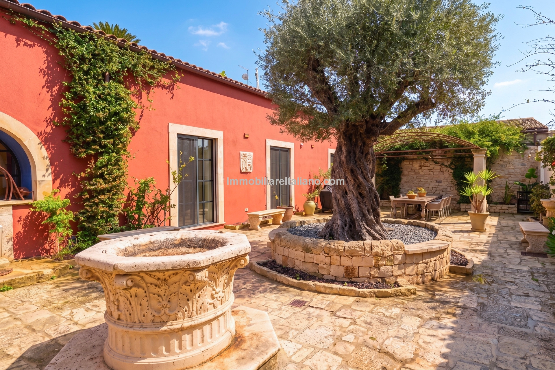 This Sicilian wine estate for sale is located in the municipality of Comiso, within the province of Ragusa, in southern Sicily. The property extends over approximately 10.5 hectares (25.9 acres), including 7.4 hectares of productive vineyards within the Vittoria DOCG area, known for quality Sicilian wine production. The estate combines a restored residential villa, guest accommodation, landscaped grounds, and a fully operational winery, producing up to 60,000 bottles per year. This positions the property as both a private residence and a working vineyard estate, suitable for buyers seeking an Italian wine business, vineyard investment, or lifestyle property in Sicily.