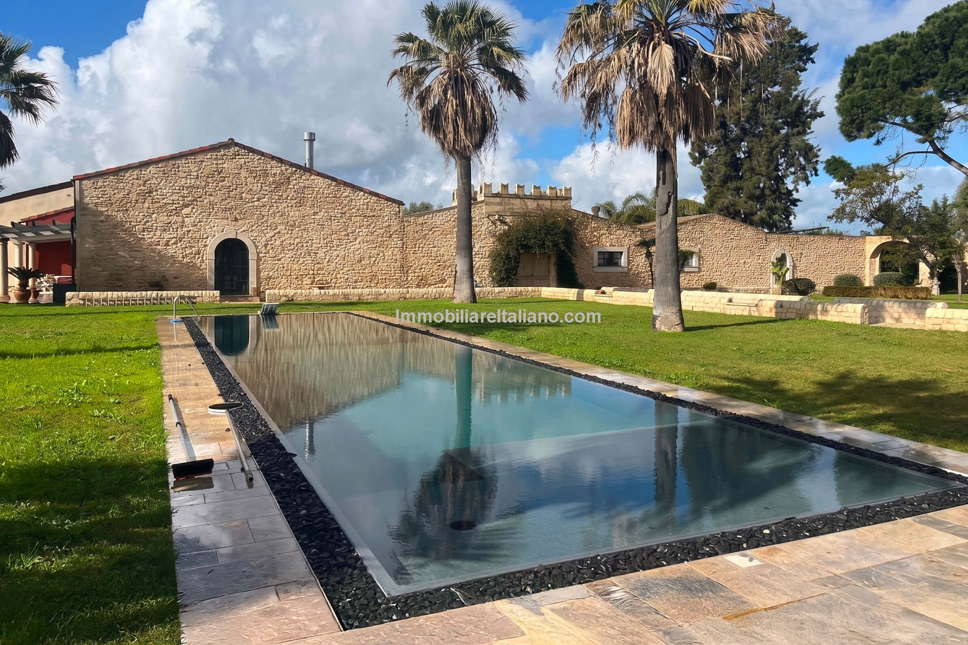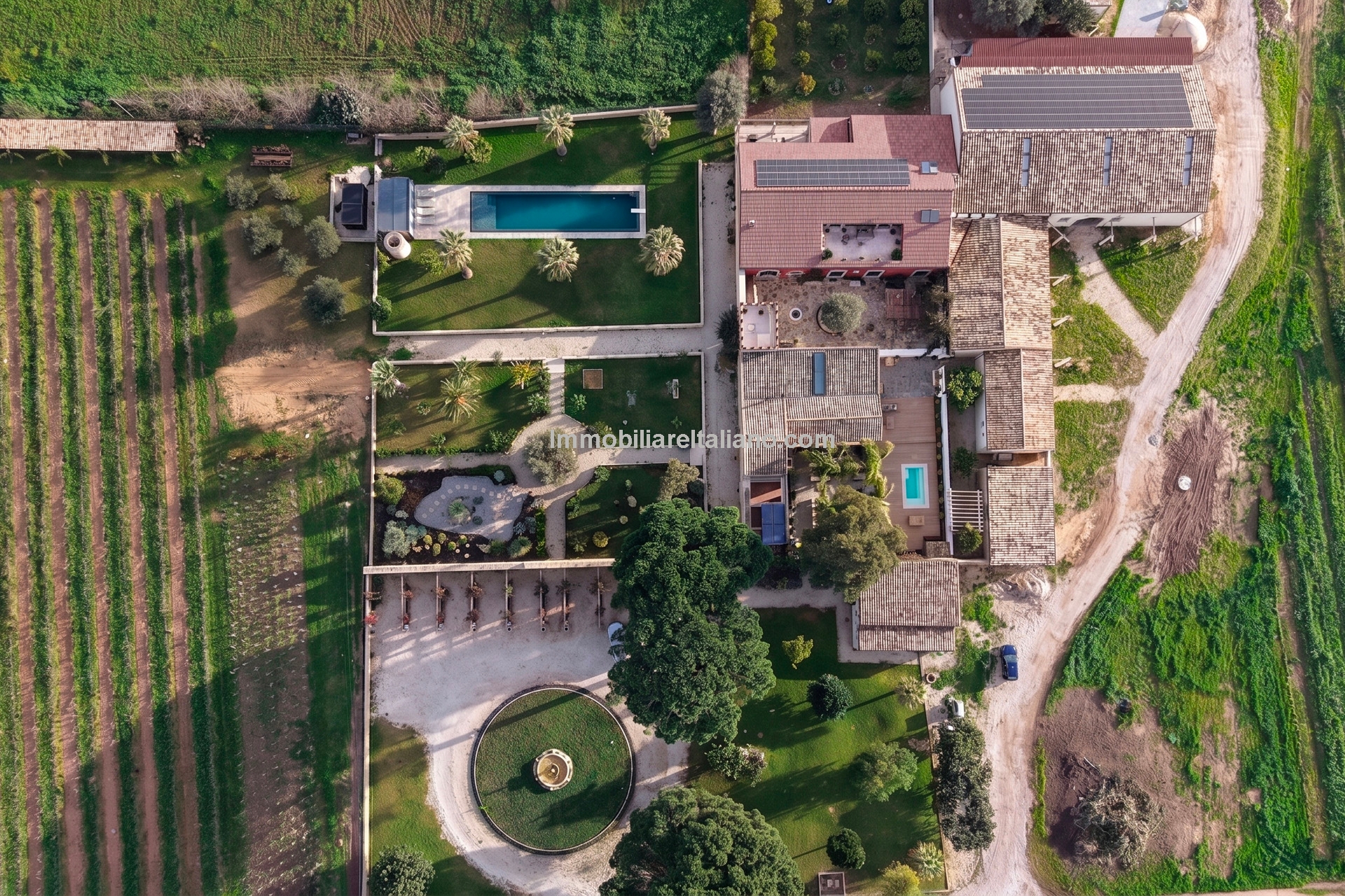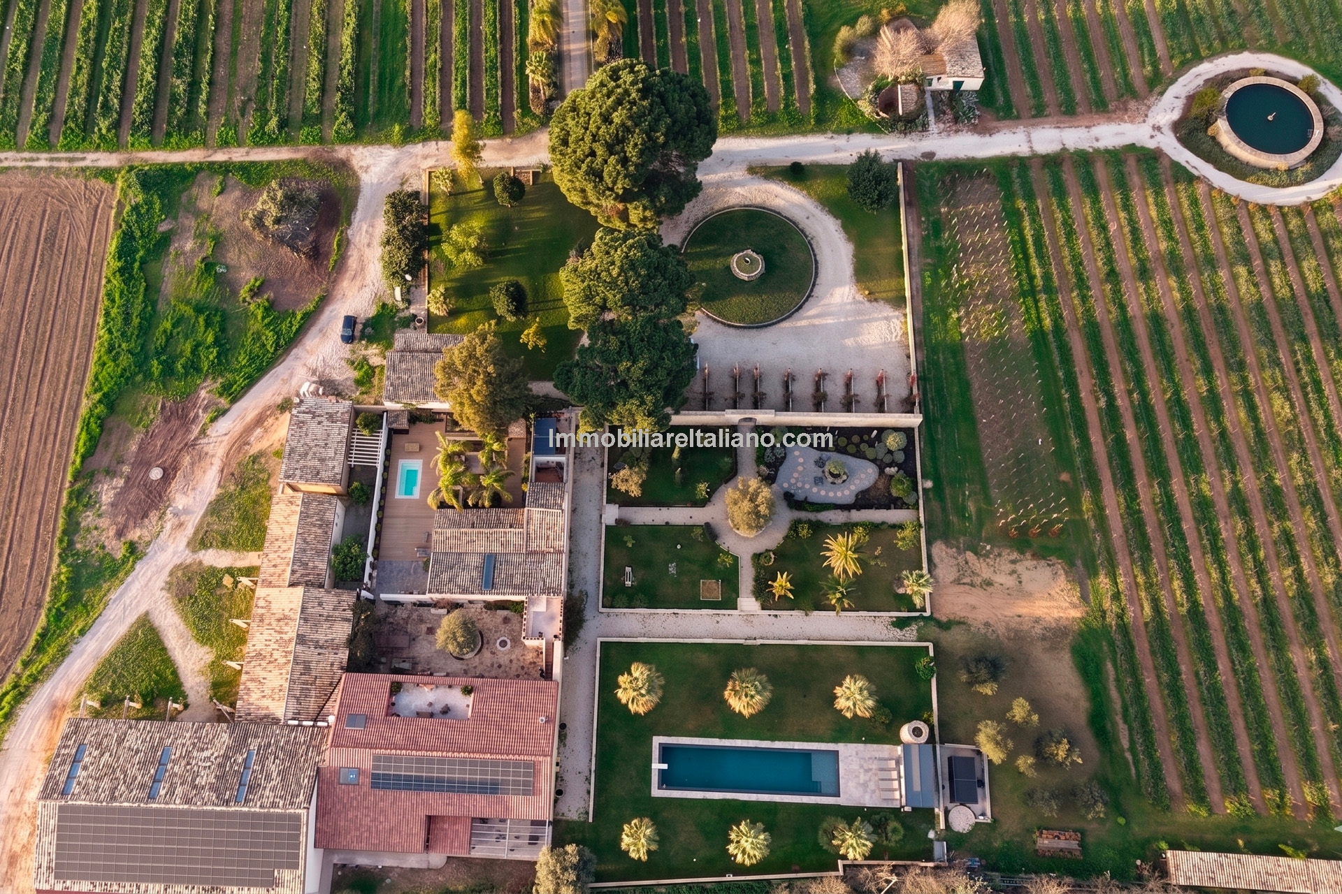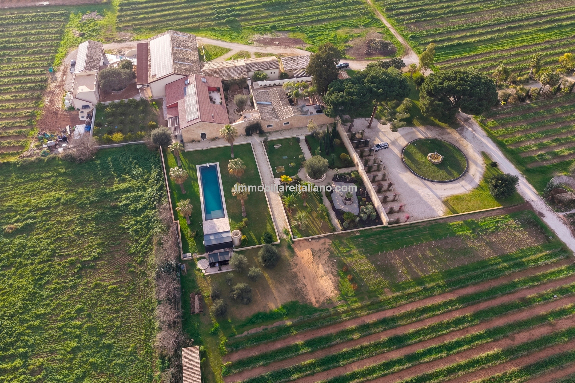 Externally, the estate includes landscaped gardens around the buildings, a 19 × 4 metre swimming pool, and open land with vineyard rows. The vineyards are planted with a mix of grape varieties typical of Sicilian wine estates, supporting consistent annual production. The winery is modern and fully equipped, with dedicated areas for fermentation, storage, and wine processing, allowing the business to operate independently on site. Infrastructure includes private wells for water supply, electricity connection with solar support, internet connectivity, and paved access roads.