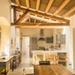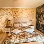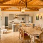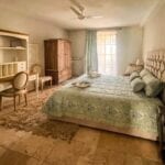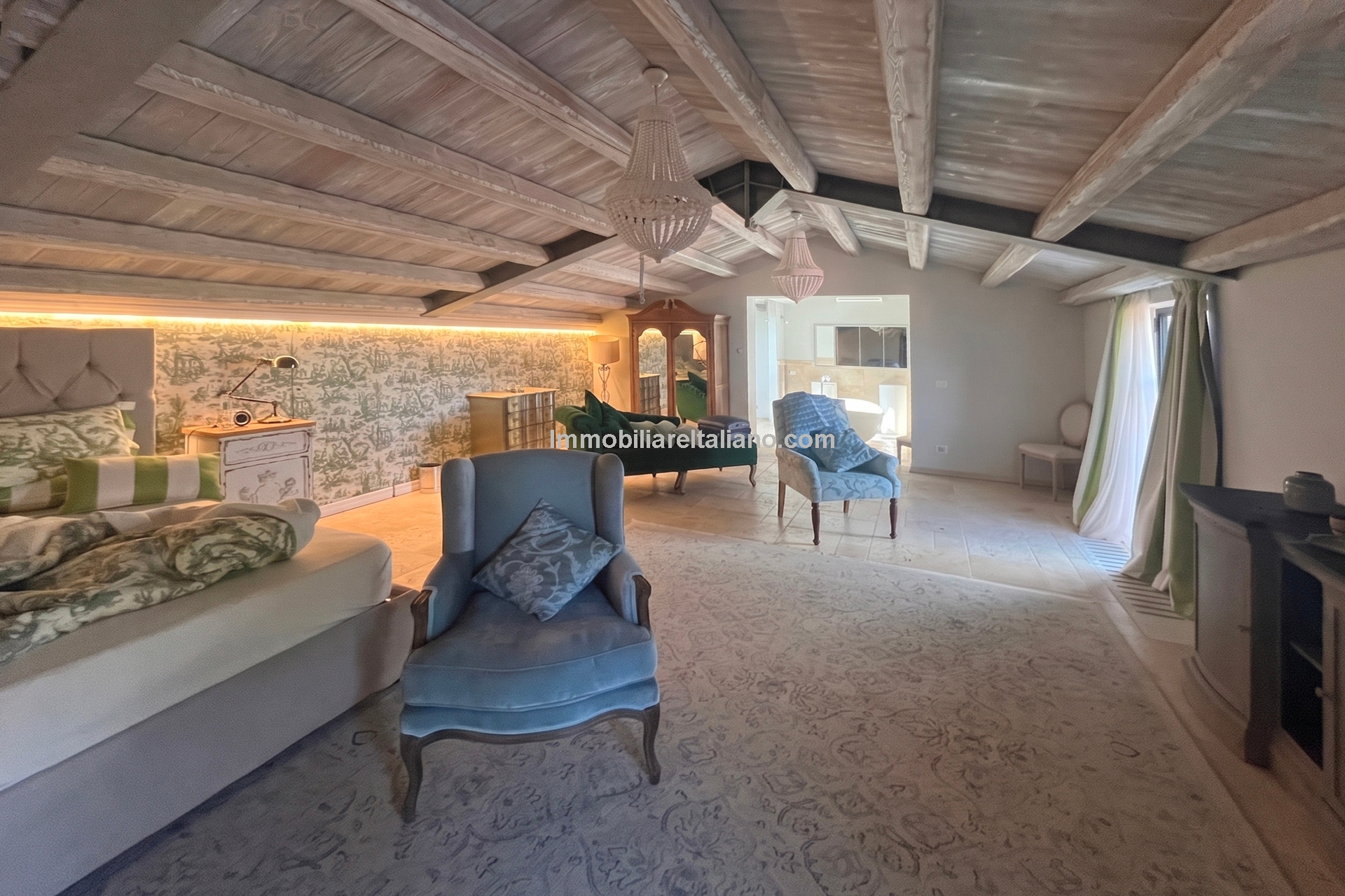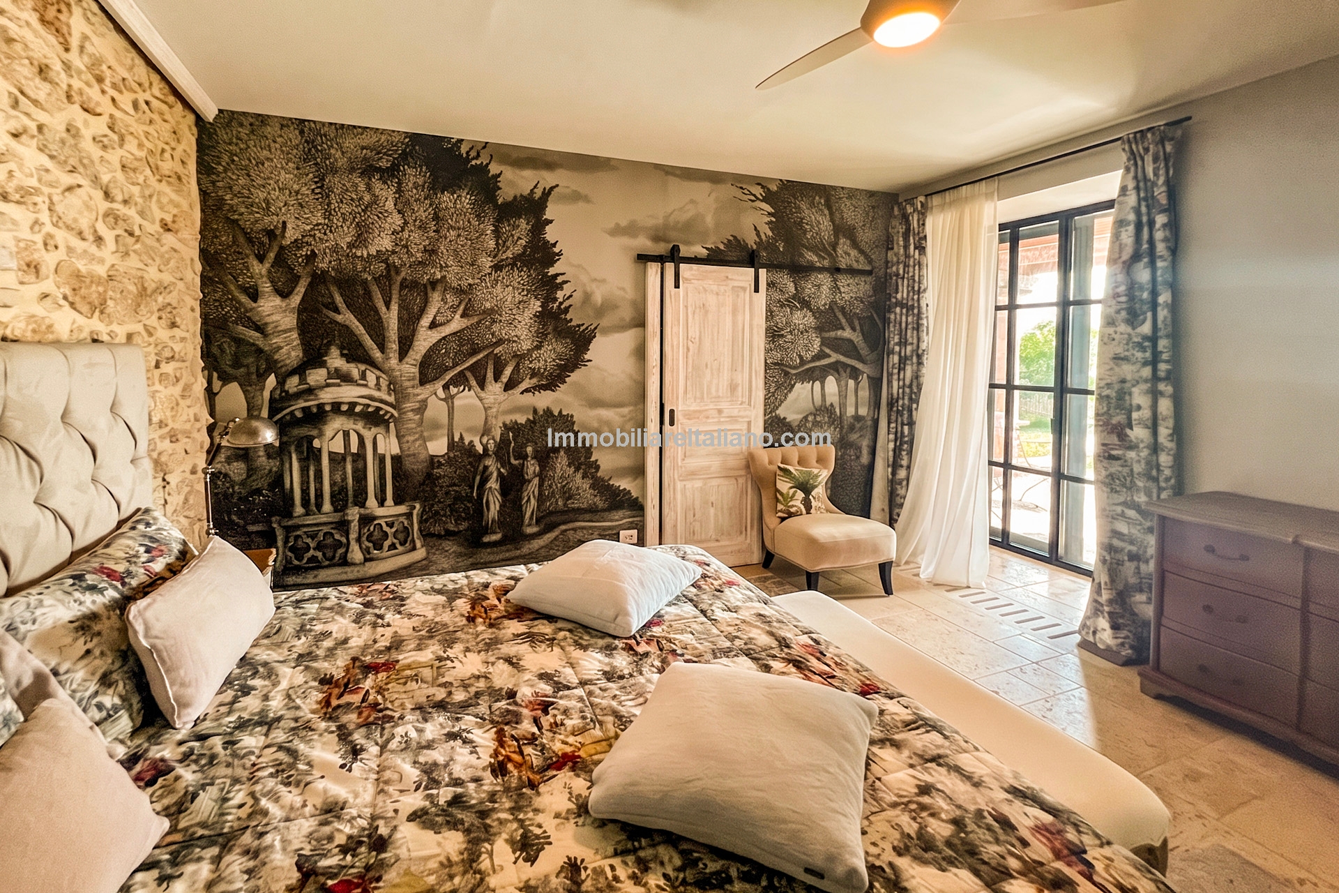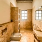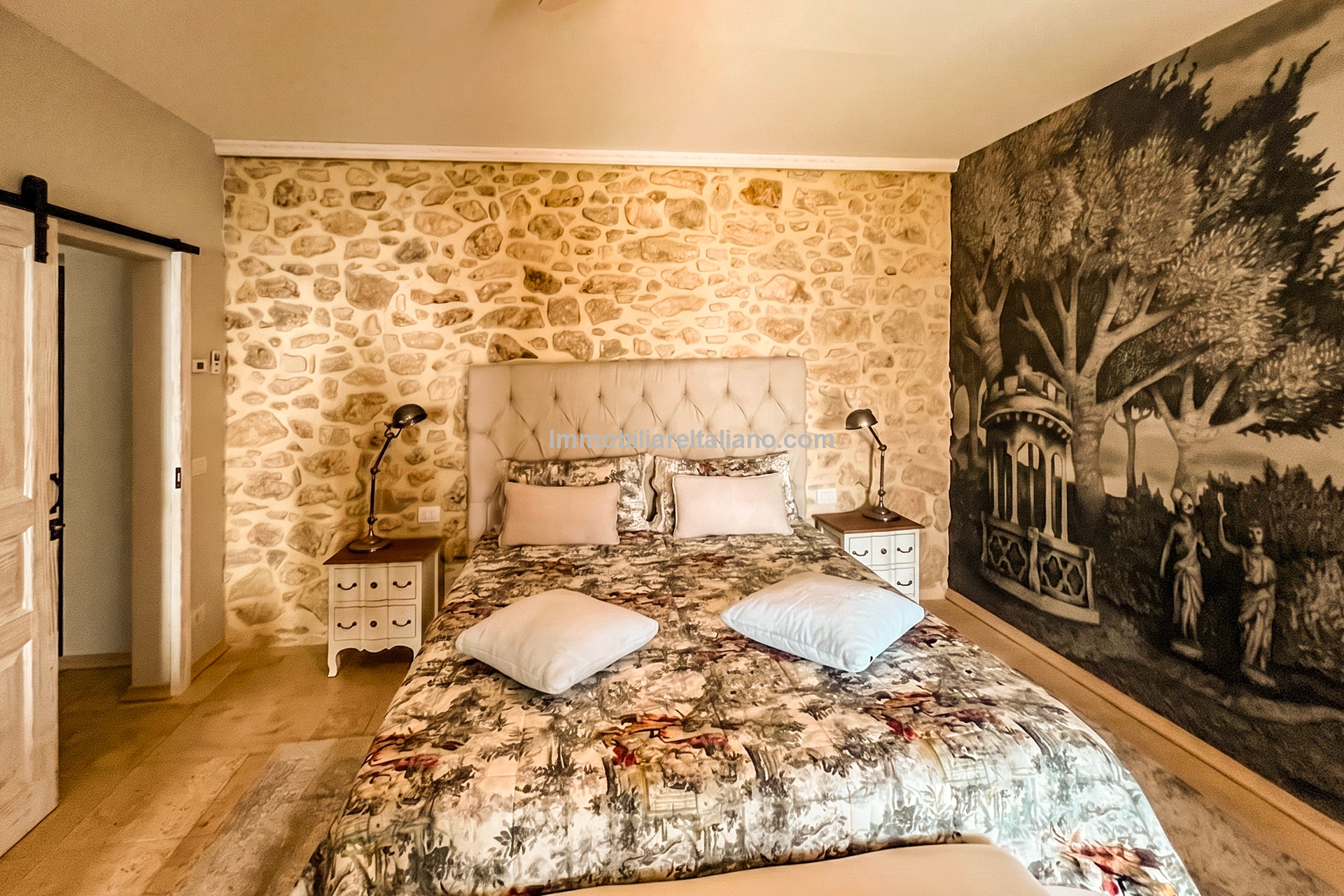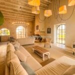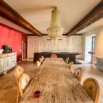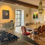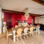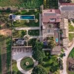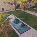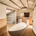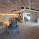 The main villa offers approximately 775 square metres (8,339 sq ft) of interior space arranged across 30 rooms, including five bedrooms and five bathrooms. The building has been restored and retains traditional materials such as stone walls, wooden beams, travertine flooring, and an original fireplace, combined with modern systems including a heat pump, photovoltaic energy system, and high energy efficiency rating (A2). The layout includes large living areas, kitchen and dining space, and direct access to the garden and pool areas. A paved internal courtyard connects the main residence with guest accommodation, providing additional privacy and flexible use for hosting visitors or staff.