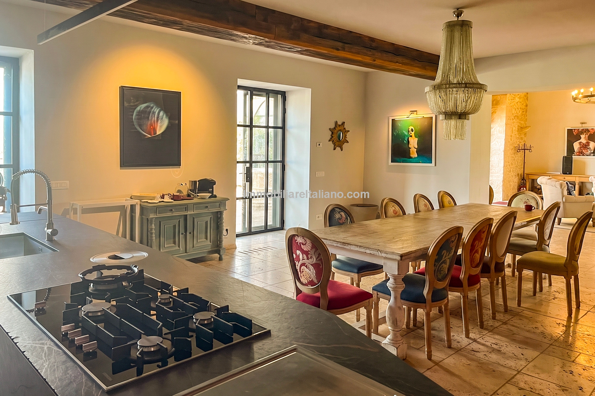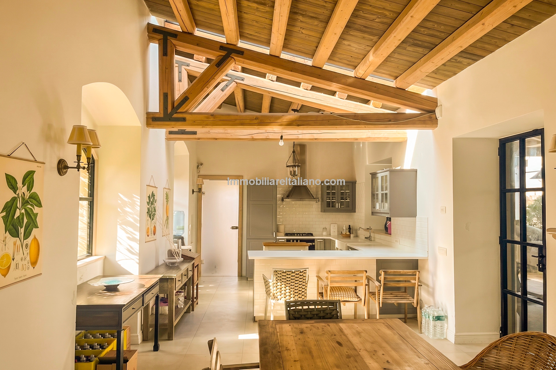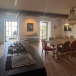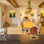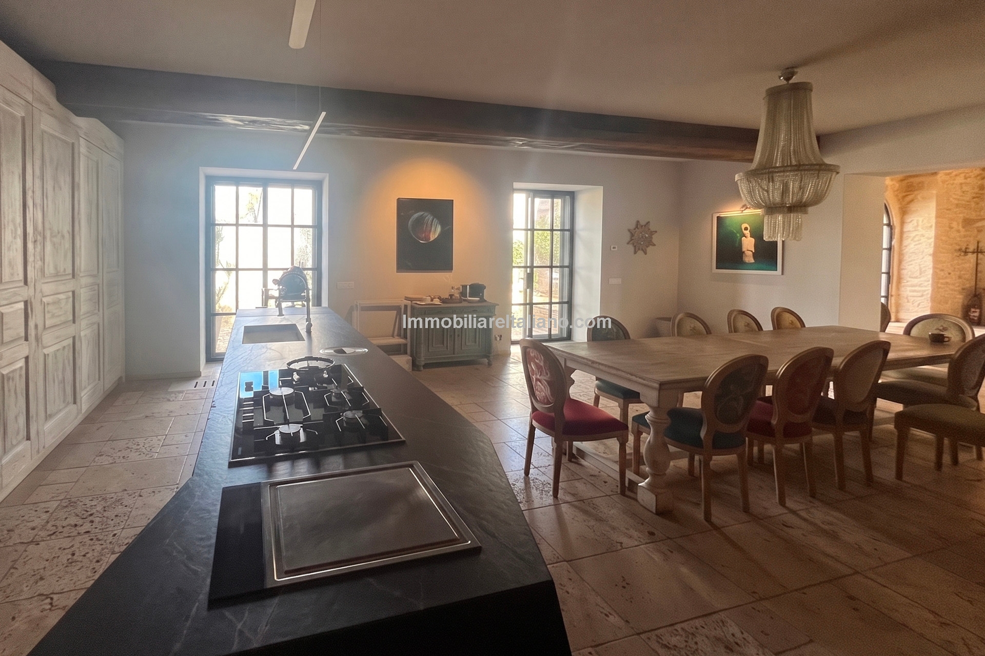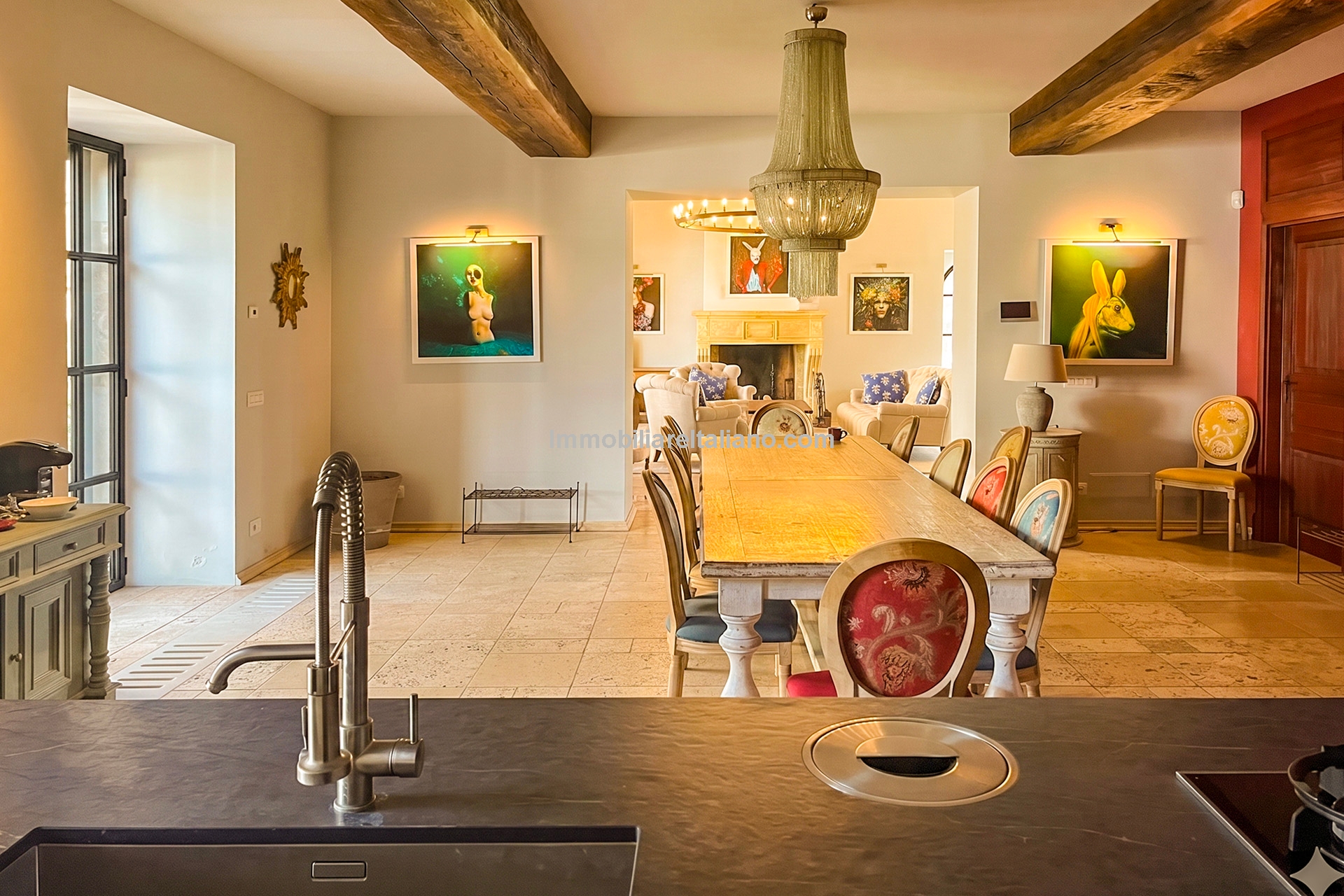The main villa offers approximately 775 square metres (8,339 sq ft) of interior space arranged across 30 rooms, including five bedrooms and five bathrooms. The building has been restored and retains traditional materials such as stone walls, wooden beams, travertine flooring, and an original fireplace, combined with modern systems including a heat pump, photovoltaic energy system, and high energy efficiency rating (A2). The layout includes large living areas, kitchen and dining space, and direct access to the garden and pool areas. A paved internal courtyard connects the main residence with guest accommodation, providing additional privacy and flexible use for hosting visitors or staff.