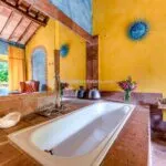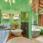 Guesthouse A (69 sqm – 742 sqft, 2 bedrooms, 2 bathrooms) is located next to the main villa and is connected by a canopy at the event kitchen’s exit. When we enter the bottom floor, we find a large living area, a kitchen, and a bathroom with a shower. Going upstairs, we find the sleeping section, which has a huge master bedroom, twin bedrooms, and a common bathroom.