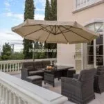 On the ground floor, you enter the villa itself. The main door opens into a huge and bright living room with a fireplace. From here one can then pass into an office space, the spacious dining room with a 16-seat table, a generous kitchen fitted with all the appliances, and the bathroom. Outside, a nice paved terrace runs around the building and includes a cosy outdoor dining area right above the pool.