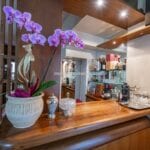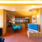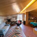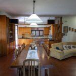 An internal staircase leads to the first floor, where there is an entrance that gives direct access both to the living area, consisting of a kitchen, living room with bar corner and fireplace, and to the sleeping area, where there are three bedrooms and two bathrooms. On this floor, all the rooms are connected with large terraces that surround the entire floor, one of which has a large space to accommodate a table and relaxation areas, adjacent to the kitchen and living room.
