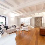 The villa has light-toned parquet floors, with plastered and white-painted walls. Roofs are sustained by wooden beams which have been painted white.