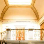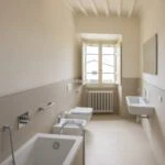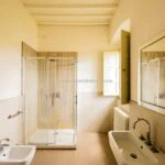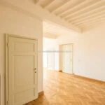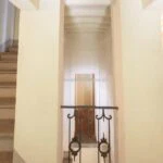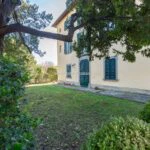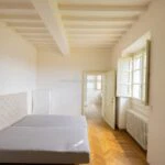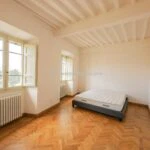 The historic facade of the villa stands out, along with the large wooden doorway that leads to a hallway. The first floor is reached by a beautiful pietra serena stairs bathed in natural light from the skylight above. The restored frescoed walls and the painted iron railings add to the home’s beauty and history.