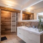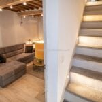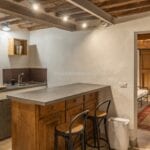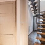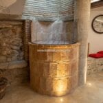 The ground floor contains a spacious tavern room with exposed stone and brick walls, and the presence of an original historic well, an architectural element that reflects the building’s long history. Sandstone stairs lead to the upper floors, where traditional materials such as wooden beams and parquet flooring remain visible.