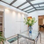 The first residential level includes the main living area with a living room, kitchen, dining room with a glass ceiling, bathroom, laundry room, and a study. The upper floors house the sleeping area, with each level featuring a large bedroom with an en-suite bathroom, providing privacy and a practical layout for residents or guests.