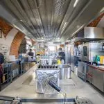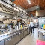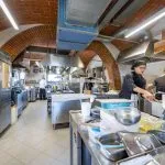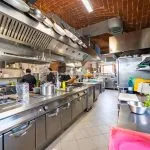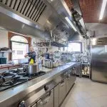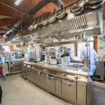 The ground floor of the building is entirely used as a restaurant, with two generous and bright halls (seating about 40 PAX), guest bathrooms, and a large professional kitchen with a changing room/bathroom area for employees. A large terrace paved in terracotta tiles outside allows the restaurant’s capacity to be increased in summer.