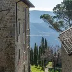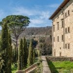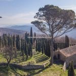 The estate’s main core, known as Borgo San Martino (approx. 2,500 m² / 26,900 ft²), consists of ten buildings that include former dwellings, a deconsecrated church, and several agricultural warehouses. The houses are structurally sound, while the outbuildings require complete restoration. Terraced gardens with cypress trees surround the hamlet and offer panoramic views across the wooded hills of Tuscany.