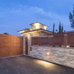 Surrounded on three sides by a concrete wall covered in travertine and topped by an iron railing the final side is closed by a wooden fence. Three gates (one of which is for cars) give access to the property. The garden (4,000 sqm) is equipped with irrigation and lighting systems with dusk sensors.