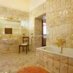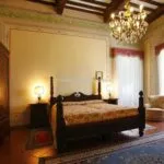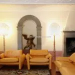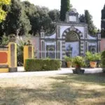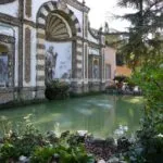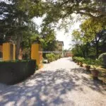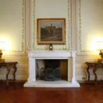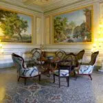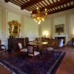 The main villa (1,280 sqm) features six bedrooms and eight bathrooms across four levels. Interior highlights include frescoed rooms, marble fireplaces, and decorative trompe-l’œil paintings.