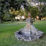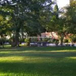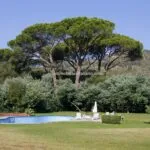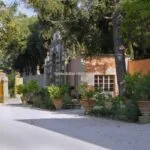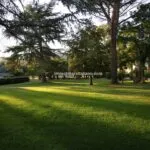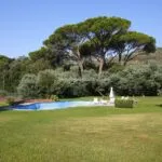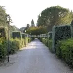 The fenced park retains its historic design and includes paved walkways, olive and fruit trees, and a now-unused holm oak grove. A newer entrance leads to the orangery, while the original driveway remains intact. The swimming pool (18 × 9 m) has a natural stone border and is accompanied by changing rooms and bathrooms. The tennis court is made of clay.