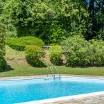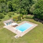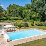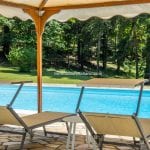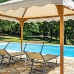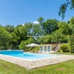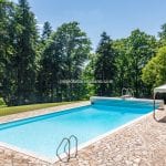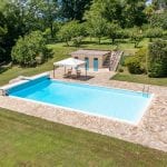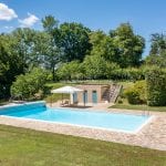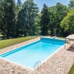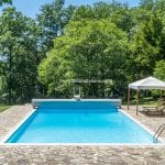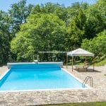 Close to the house is the 14 × 7 m swimming pool with stone solarium and a 24 sqm (258 sqft) pool house with bathroom, changing rooms and showers. Additional outbuildings include a 29 sqm former chicken coop, an 8 sqm tool shed, a 16 sqm firewood shelter, and an 84 sqm agricultural storehouse.