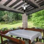 Additional buildings on the property include old animal stables (43 square metres) and a farm shed (41 square metres) located in a nearby clearing. The property also boasts a 12 × 6-metre swimming pool with lighting, a pergola with a wood-burning oven, and access to bathing in the natural pools along the Farma River.