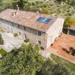 - MAIN FEATURES: Stone walls, wooden beams, parquet and terracotta floors, brick arches, fireplaces, stone staircase, designed by Gae Aulenti, porch, garden, swimming pool, sunbathing area, gym and fitness area, olive trees, ruins to be restored, solar panels