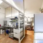 The upper floor is devoted to the restaurant, featuring two large dining halls, a professional kitchen, and a bar.