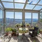 The ground floor includes a living room, kitchen, bedroom, bathroom, and solar greenhouse.