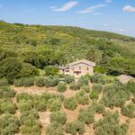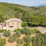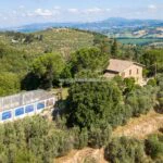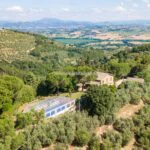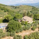 Overlooking the medieval historic town of Bettona on the green hills of Umbria is this farmhouse for sale. The property consists of two buildings (surface area 330 sqm in total) and currently, there are 4 bedrooms and 3 bathrooms. It is possible to make a small wellness centre in the old barn. On the 1.6 hectares of land surrounding the house, there is a 15 × 6 m covered swimming pool and an olive grove with 400 trees.