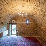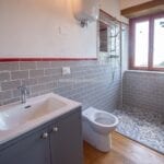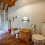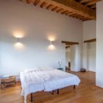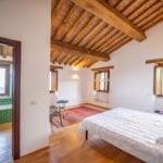 The eastern portion of the farmhouse, which carries the hallmarks of its ancient tower, spans 215 square meters (2,313 square feet) and features five bedrooms and four bathrooms. Upon entering the shared entrance on the raised ground floor, a small hallway leads to a staircase ascending to the second floor. Here, a central living room with a cosy fireplace unfolds, leading to a master bedroom with a private bathroom and a charming guest bedroom. Ascending further, the staircase guides you to the kitchen, located directly above the living room, which connects seamlessly to a bathroom, a bedroom, and a second bedroom with a private bathroom and a walk-in closet. A small staircase nestled in the bedroom’s entrance hall ascends to the tower’s uppermost level, revealing a spacious panoramic bedroom with an attached bathroom and a loft area.