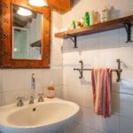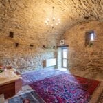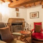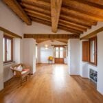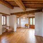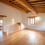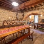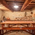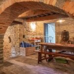 The farmhouse stands in excellent condition, thanks to meticulous restoration work that has diligently preserved its original features. Notably, the older wing on the western side exudes a timeless charm, with imposing stone walls that once served a defensive purpose, wooden ceiling beams, and a cellar boasting a vaulted stone ceiling, now repurposed as a tranquil yoga and meditation room.