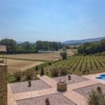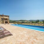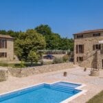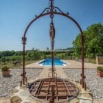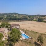 The farmhouses are surrounded by 5,300 square metres (1.3 acres) of land. Between the two buildings is a terracotta-paved courtyard which then leads to the 16 × 5 m swimming pool (depth 1.2 to 1.8 m) located on top of the slope.