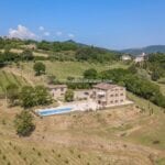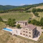 In the green hills of Umbria and close to the border with Tuscany are these fully restored farmhouses (594 sqm, completed in 2017) which have been turned into three independent apartments (two in the main farmhouse and one in the other) giving a total of 3 lounges, 3 kitchens/diners, 8 bedrooms, 11 travertine-tiled bathrooms and 3 service rooms.