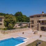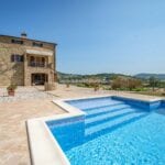 The buildings have 360° panoramic views and are surrounded by 5,300 sqm of land including a well-maintained garden with a paved courtyard and a beautiful fully tiled mosaic 16 × 5 m swimming pool.