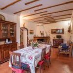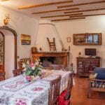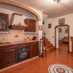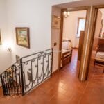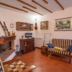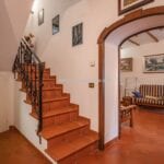 The villa is arranged over two floors. The ground floor includes a kitchen, a dining room, and a living room with a fireplace, creating a practical living area suited to year-round use. The first floor contains three bedrooms and two bathrooms. The building retains traditional Tuscan materials, including stone and brick walls and terracotta flooring, while also incorporating modern improvements such as new PVC shutters and a recently installed gas boiler.