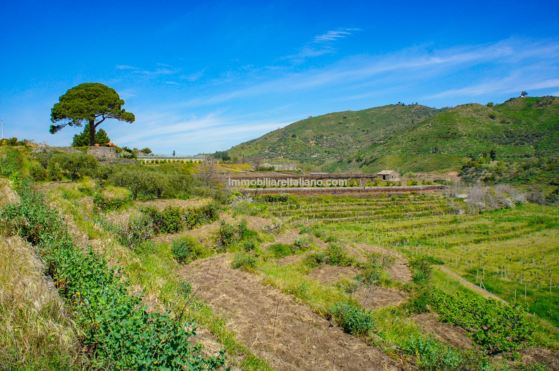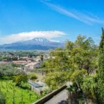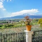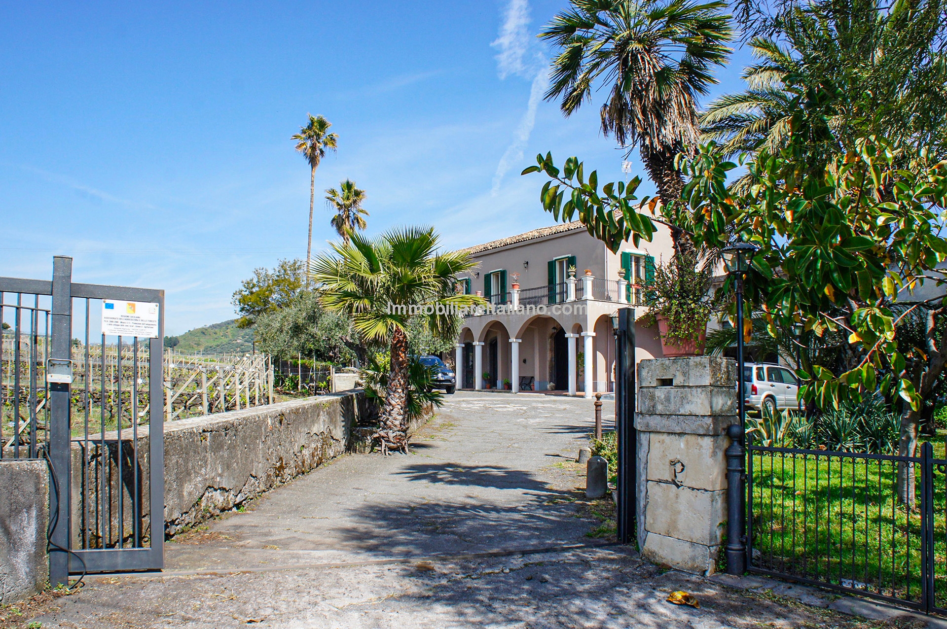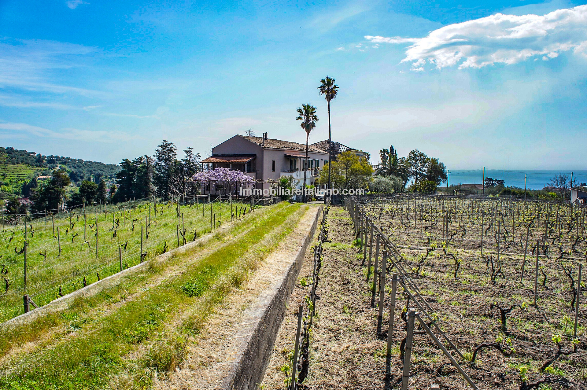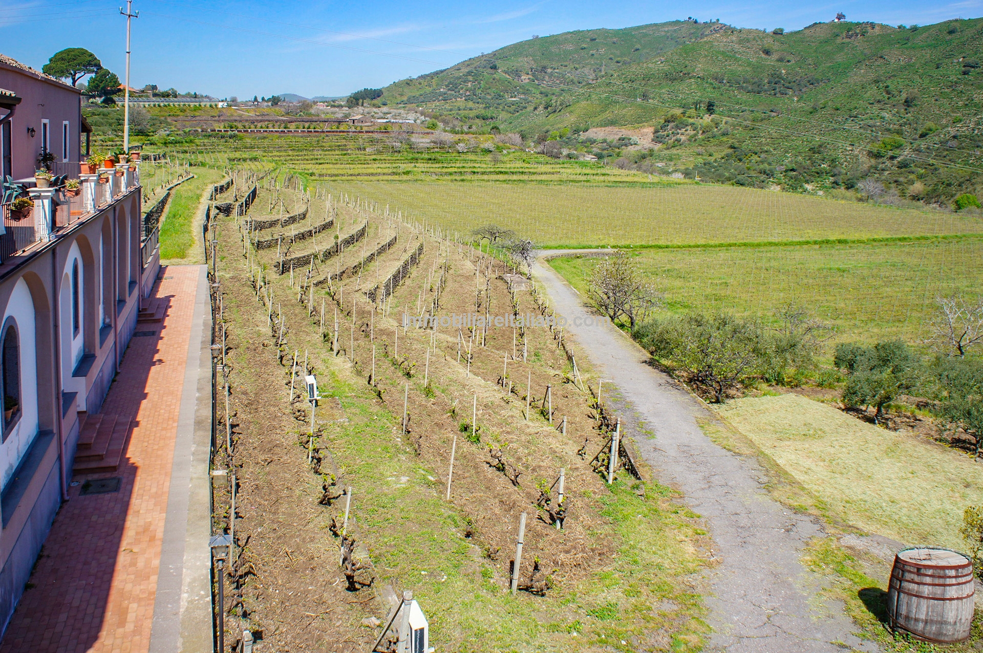 This wine and farm estate for sale is located in Piedimonte Etneo, in the province of Catania, just below Mount Etna. The property extends over 11.3 hectares and offers panoramic views of the Mediterranean Sea and surrounding countryside, with a combination of agricultural production and hospitality use.