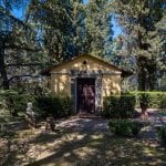 The estate grounds include several additional structures: a private chapel (21 sqm), a lemon house (55 sqm), a pool house (9 sqm), and a 447-sqm agricultural storehouse. The landscaped garden of roughly 10,000 sqm surrounds the driveway and includes a 15 × 8 m swimming pool and a concrete tennis court (needs refurbishing).