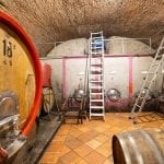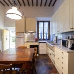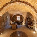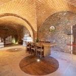 Nearby, a 1,061 sqm farmhouse has been divided into eleven independent apartments, each with kitchen and bathroom facilities, ranging from studio flats to larger two-bedroom units. This building also includes two garages and the historic cellar with vaulted ceilings.